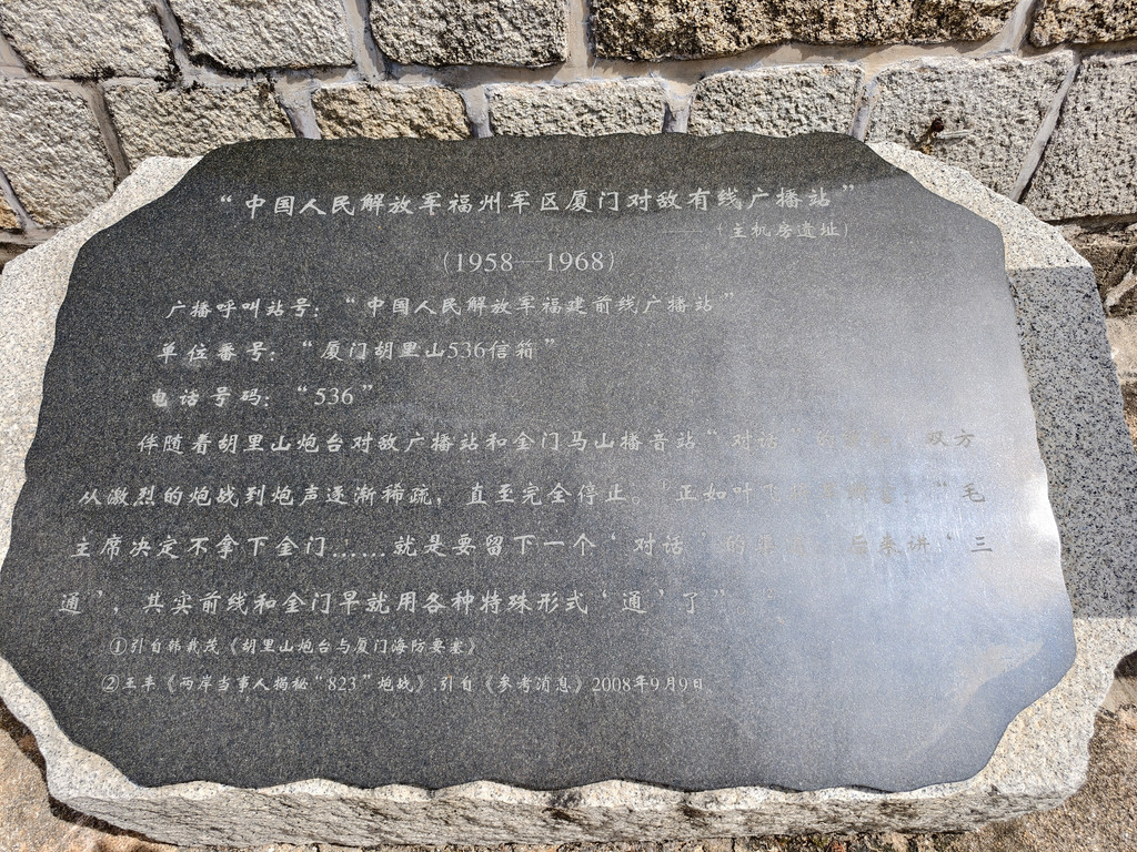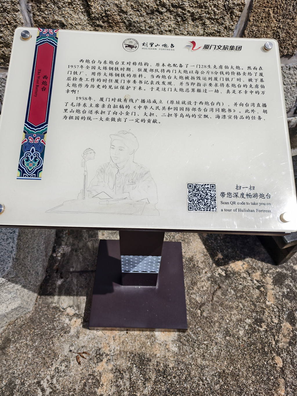 没有了克虏伯大炮的胡里山炮台西炮台成为1958年对金门“8.23”炮战期间成立的中国人民解放军福州军区厦门对敌有线广播站的播出主机房,1958年10月06日《中华人民共和国国防部告台湾同胞书》就是在胡里山炮台直播的。看到我曾从军的部队前身的故地,不免顿生几分亲切感。