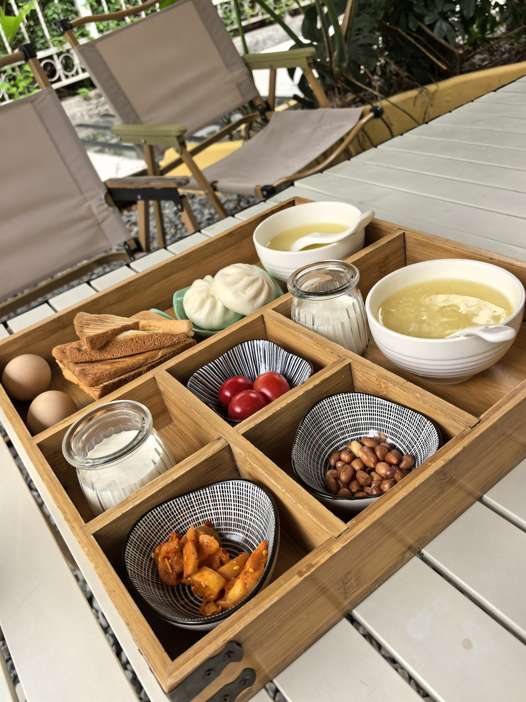 早餐是固定好的,每人一份,不够可以续,三明治、牛奶、稀饭、包子、咸菜、水果,想续哪个续哪个。店里会备免费的挖沙工具,小朋友可以自行挑选,回来记得归还。