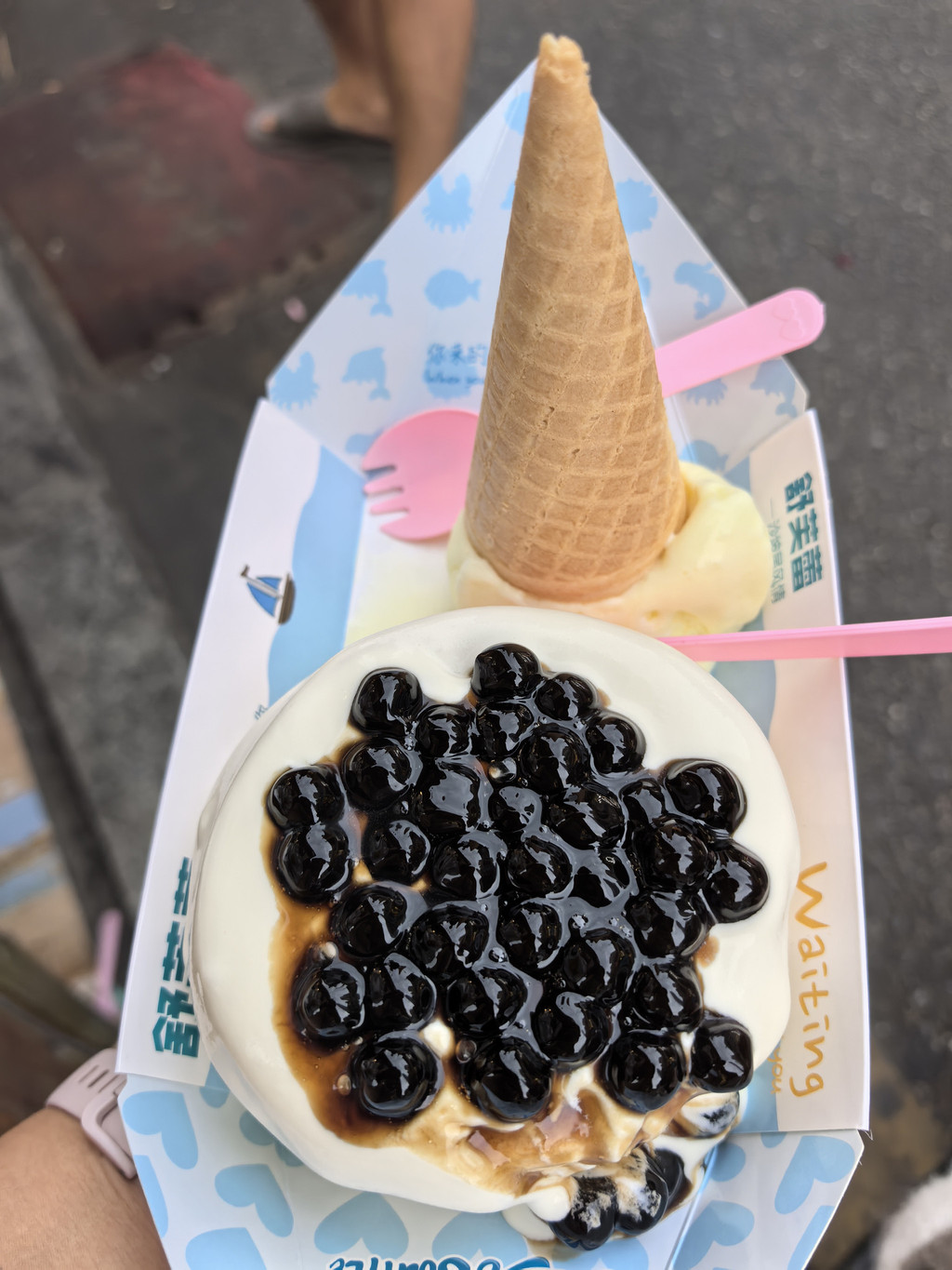 沙坡尾:之前被网络上所谓的“艺术气息”所吸引,但是我去了以后觉得罢了,就是有很多商店,适合买点纪念品,找个有调调的咖啡店发发呆,而且有许多很特色的甜品店,有一家豆腐冰淇淋店,但是我女儿不喜欢就没有买,买了本地人推介的街口一家舒芙蕾+冰淇淋,就很普通没有什么惊艳的。也可能我没有走对地方,但是我对这里没有太多的感觉。