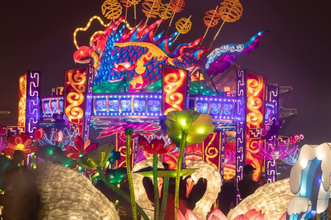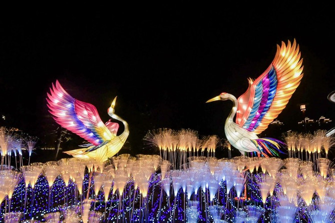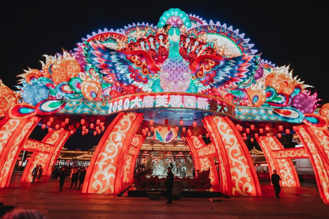 芙蓉园入口的孔雀花灯,是世界吉尼斯认证“全球最大立式灯笼”,气势恢宏,锦羽婆娑。