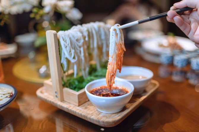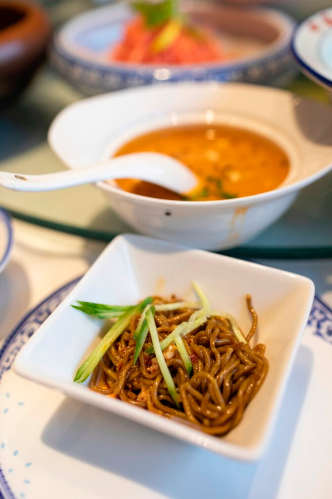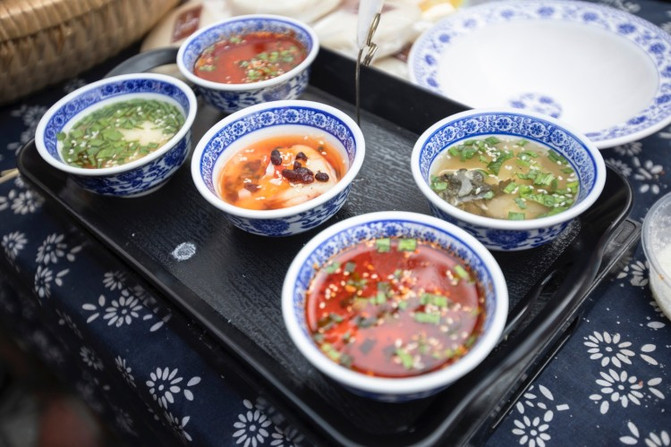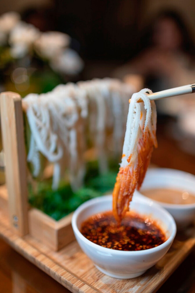 酿(rang)皮皮薄色亮、口感筋道,浇上红红的辣椒油,辛香的葱花和香菜,盖上一层细条状的羊肝子,辣中有麻、麻中有香,分外引人食欲。