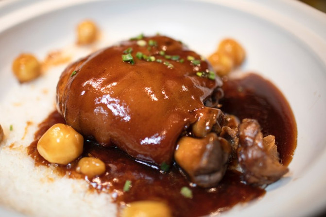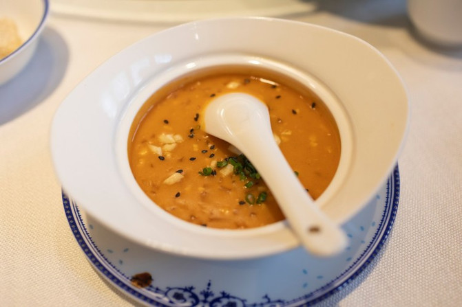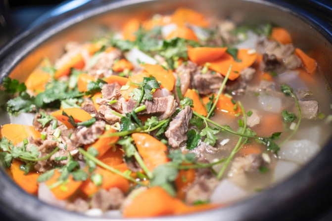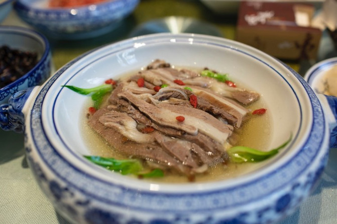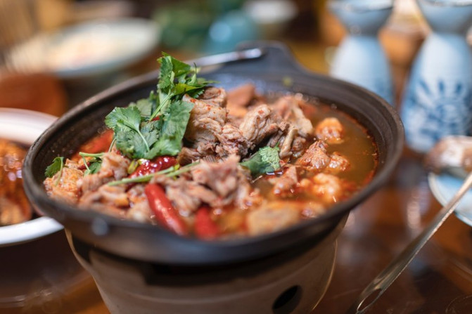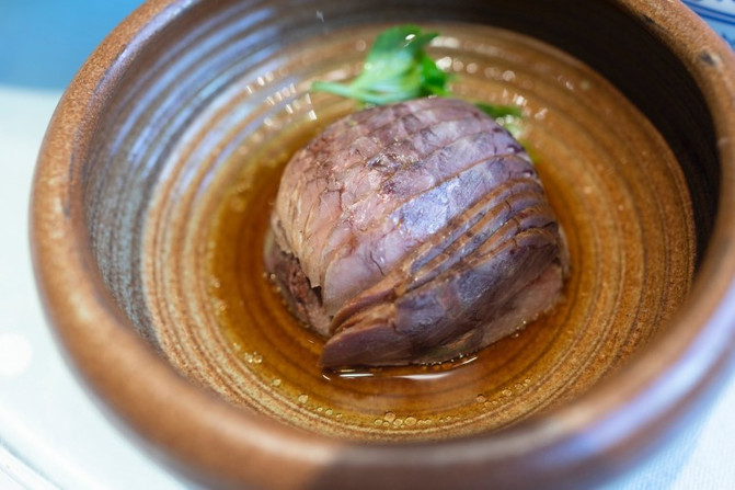 倒入高汤,然后用300度通红的白火石进行加热,五分钟之后,烹熟的汆烫色泽漂亮、味美汤鲜、口感颇佳。