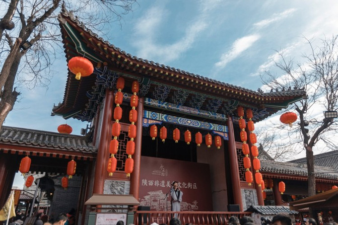 如今的永兴坊,仿古“坊、肆”建筑,以关中牌坊和具有民间传统的建筑群组合,还原了古里坊式布局,展示古长安城的街坊式形态、历史生活气息,以及传统民俗生活空间。