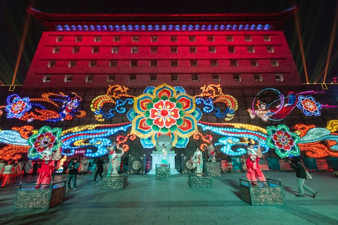 穿过闸楼,走进月城 · 绚丽夺目的《飞天乐舞》花灯的灯组和巍峨壮观的城楼与融为一体,几位飞天造型的女子,如同从敦煌穿越而来,衣袂飘飘,五彩斑斓的宝相花层层盛开重现丝绸之路盛景。