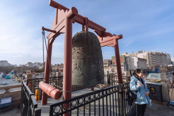悬挂于钟楼西北角仿古仪仗“晨钟”表演:时间长度15分钟,早八点半,十三名仿古武士登楼敲击仿唐景云钟24响。