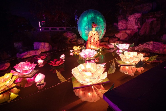 大唐芙蓉园设置了近60组灯组,盛世国韵、酷玩唐潮、天街灯市、庚子新春、梦幻森林、瑶池映月6大主题,随处可见的鱼灯、宫灯、排灯、落纱灯,生动还原《长安十二时辰》剧中的盛唐风情。