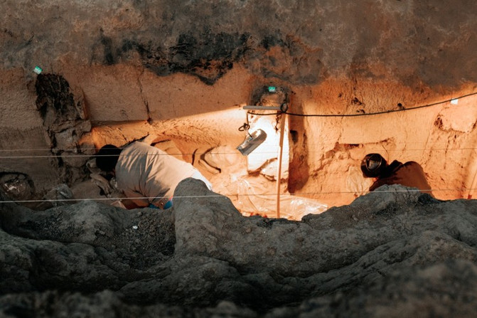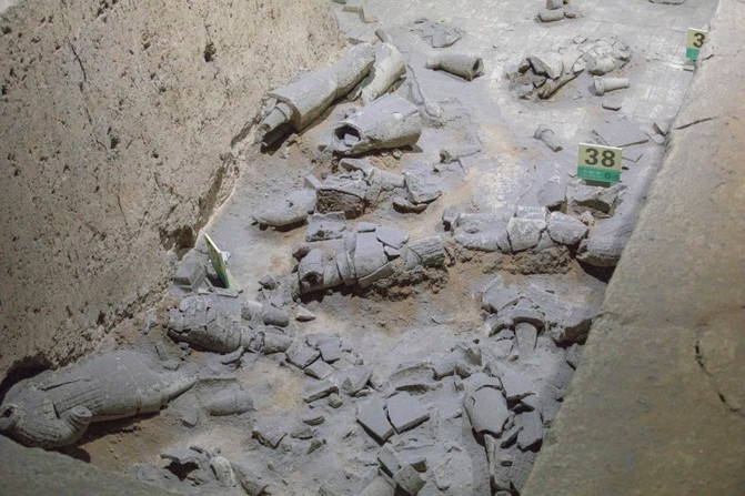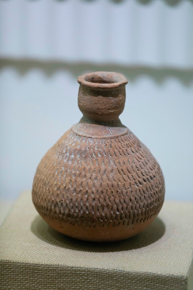 遗址中还能见到公共的墓地,有的墓地上放着瓮罐,瓮罐上边盖着陶盆,陶盆中间钻有一小孔,人死后尸骨放在瓮罐中,小孔的作用是让死者的灵魂进出方便。