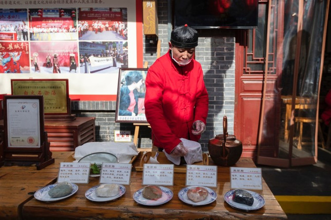 白火石汆汤是典型的石烹方式,石锅内装猪肉、香菇、小白菜、豆腐,辅料有鸡蛋清、芡粉、木耳、生姜、四季葱、枸杞、红枣等,盖上纱布