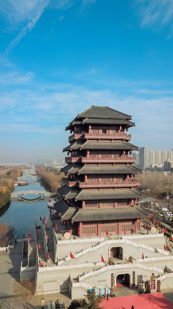 一路穿过霸城溢彩、汉桥水镇等景区,便来到大风阁,大风起兮云飞扬,威加海内兮归故乡,安得猛士兮守四方,取意《大风歌》的大风阁,是汉城湖景区的制高点,登高远眺,整个汉长安城遗址和西安北郊的景色尽收眼底。