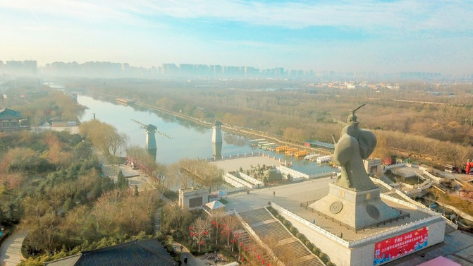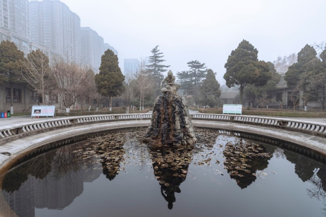 远远望见汉武大帝的雕塑矗立在高台之上,清晨的薄雾笼罩在汉城湖上。