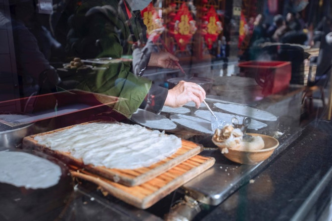 子长煎饼是用荞麦做的,薄如纸,白似银,卷入猪头肉、红烧肉、酥肉、鸡肉、炒菜、凉拌菜、热豆腐、豆腐干等就形成了多种类型的煎饼,吃的时候配上醋、蒜汤、韭花、辣油、西红柿酱、芝麻等。