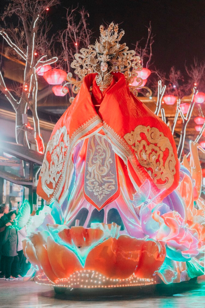 古城有城楼,华清依骊山,大唐芙蓉园的新春灯会,则以水取胜,芙蓉湖面积占三分之一,万盏花灯装扮下水天一色,灯在水里流、船在灯里游、人在灯中走。
