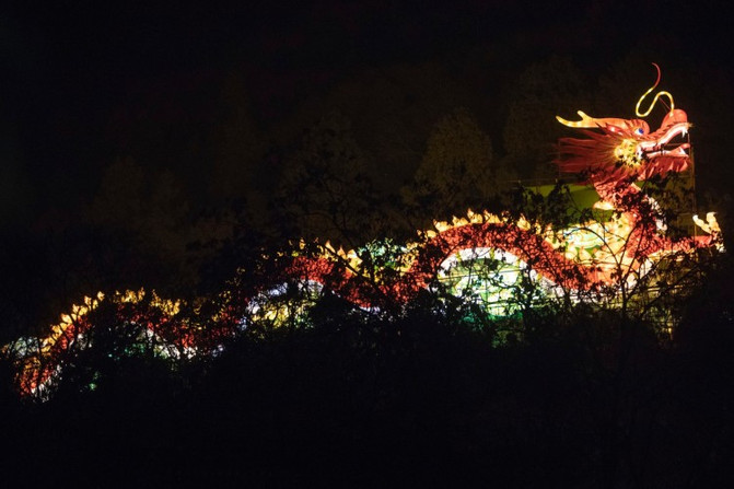 龙腾骊山,中国最高最大山体巨龙灯组,宛如一条祥龙在骊山乘风腾飞景象。