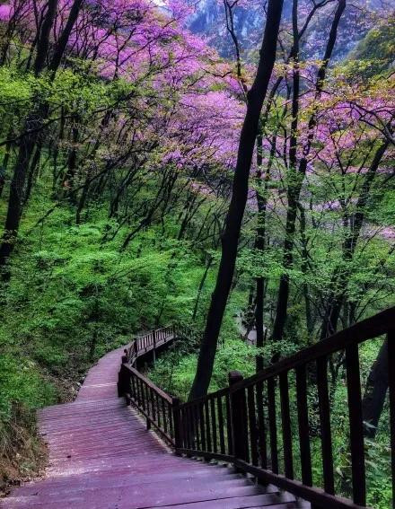 从园内停车场到景区最高处的彩虹瀑布,全部是标准整齐的步道。登山途中,两边的山坡上开满了紫荆花,密密层层,满树嫣红,一直延伸到远方……