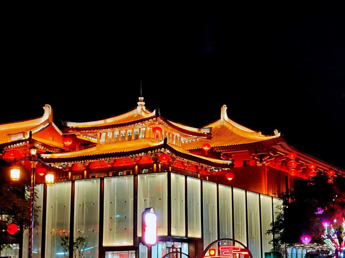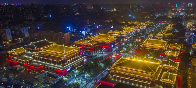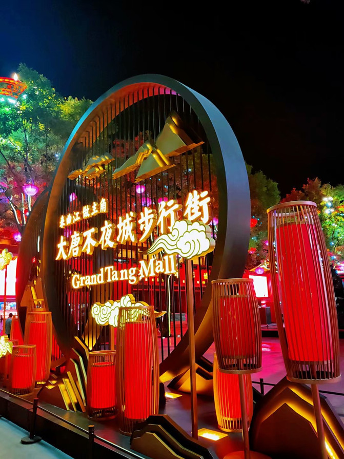 大唐不夜城位于西安曲江新区举世闻名的大雁塔脚下,南北长1500米,东西宽480米,总占地面积967亩,总建筑面积65万平方米,以盛唐文化为背景,以唐风元素为主线,以体验消费为特征,贯穿玄奘广场、贞观文化广场、开元庆典广场三个主题广场,通过灯光、雕塑、景观、文化浮雕柱、碑刻、水景、立体交通......将历史人物、英雄故事有机结合现代文化,完美地诠释了大唐不夜城