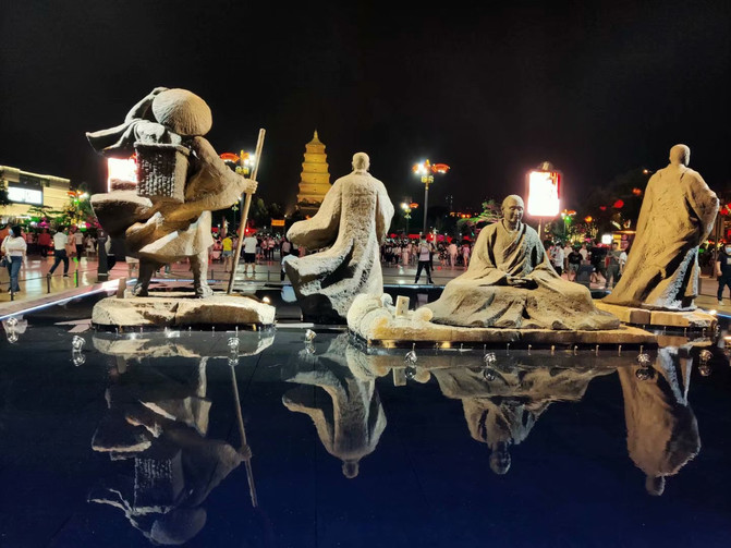 走到腿欲断才用步子丈量完这个气势恢宏流光溢彩的大唐不夜城。非常时期的人流量都可以滚出一万个人球来,想象不出正常时期这里该是怎样的摩肩接踵熙来攘往!1400多年前的长安想必也是这番景象吧!感受着鼎盛繁华内心却在喟叹国家花费巨资才打造这样一个不夜城,政府每天得用多少度电才能让这65万平方米的不夜城灯火辉煌、一万平方公里西安市区街巷通明?随车师傅似乎比我更可耐,虽然同样腿肚抽筋,但良好的职业素养硬是载着我深夜把老城墙、回民街、钟鼓楼一一参观完,半个西安城的美景就在他车轮的转动下尽收眼底。