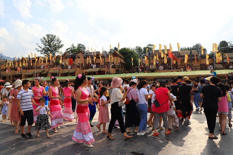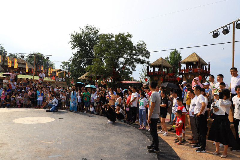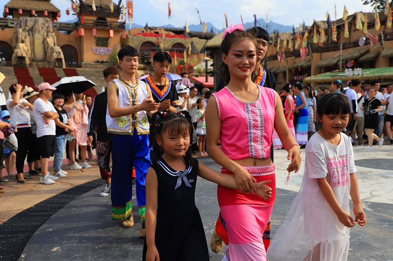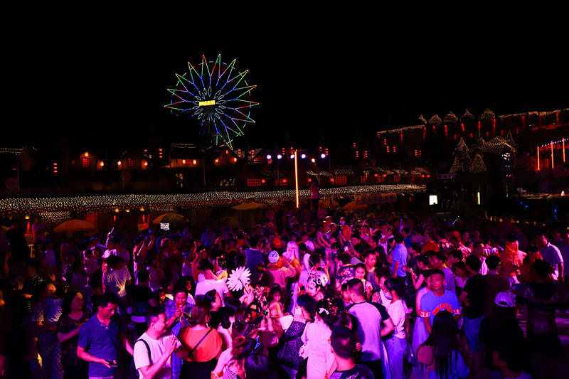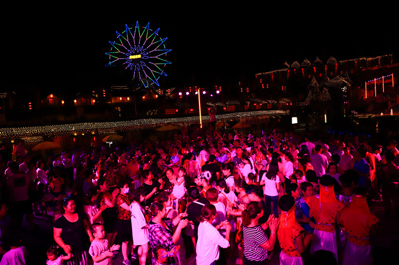 虽说白天场的演艺已经进入了最后的互动时段,但热闹的场面一点没有退缩的意思。男女老少脚下踩着卡点音乐,手舞足蹈欢快地跳着,每个人脸上都洋溢着过节的放松和欢心。