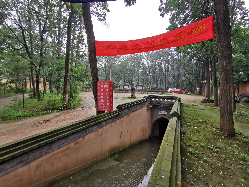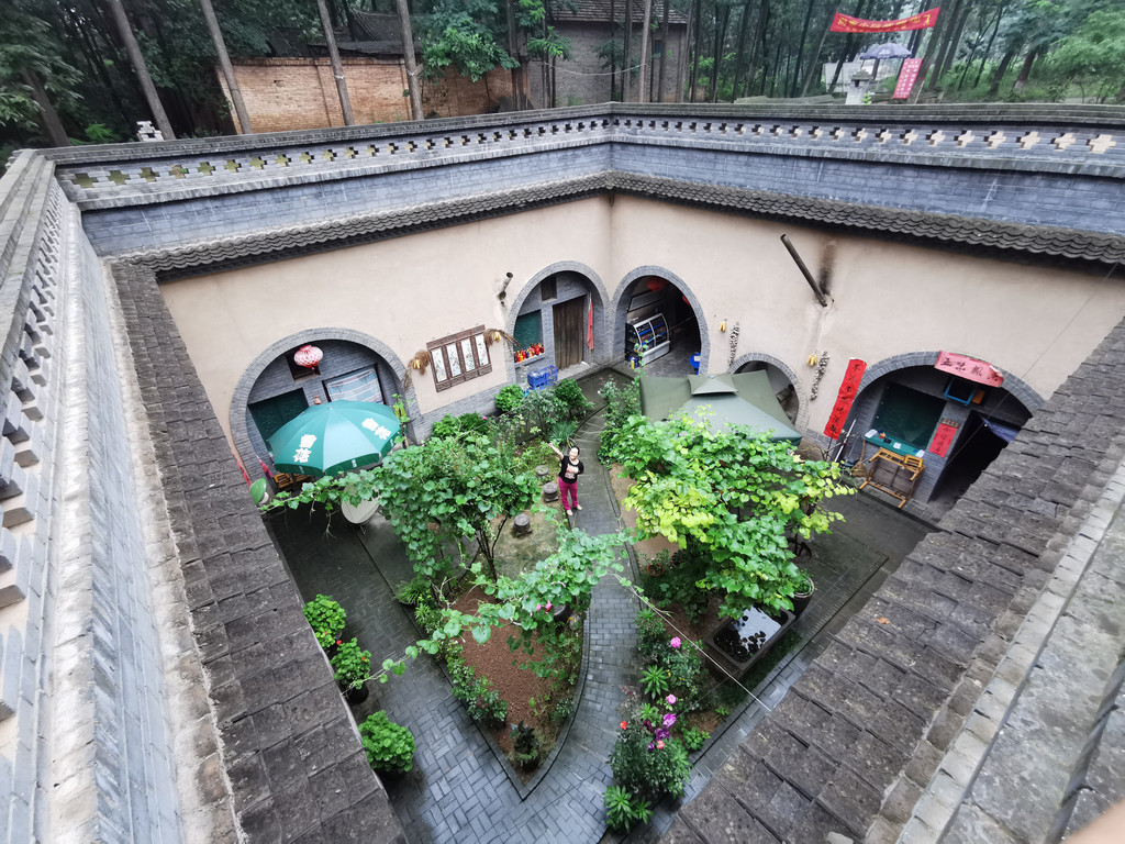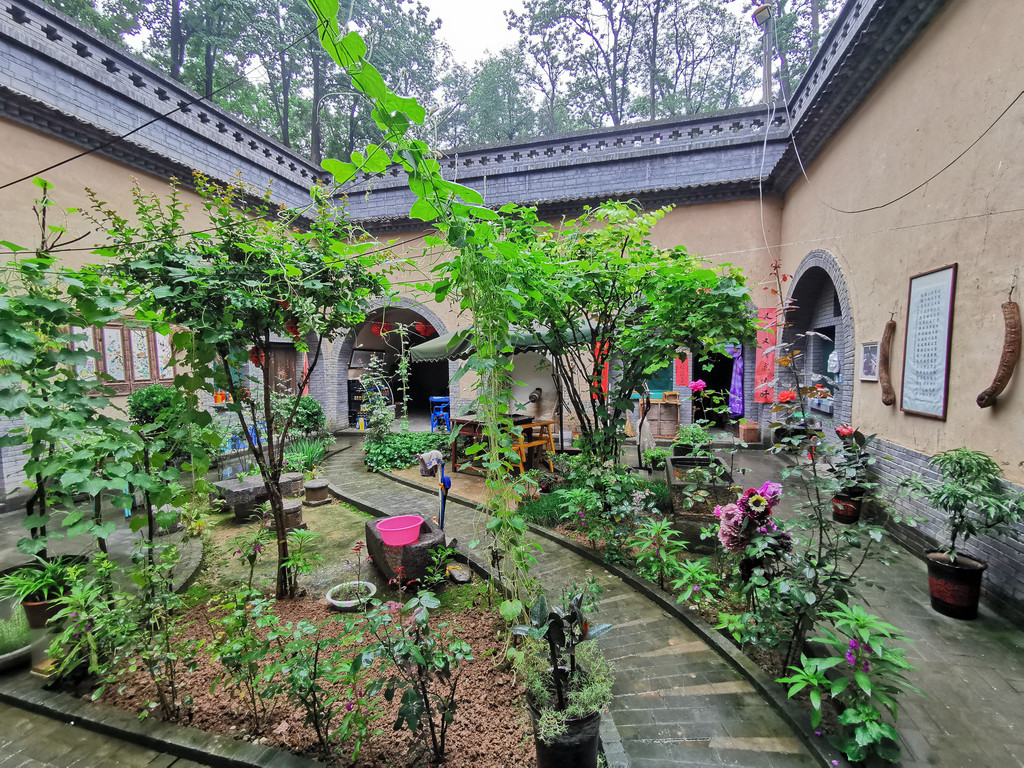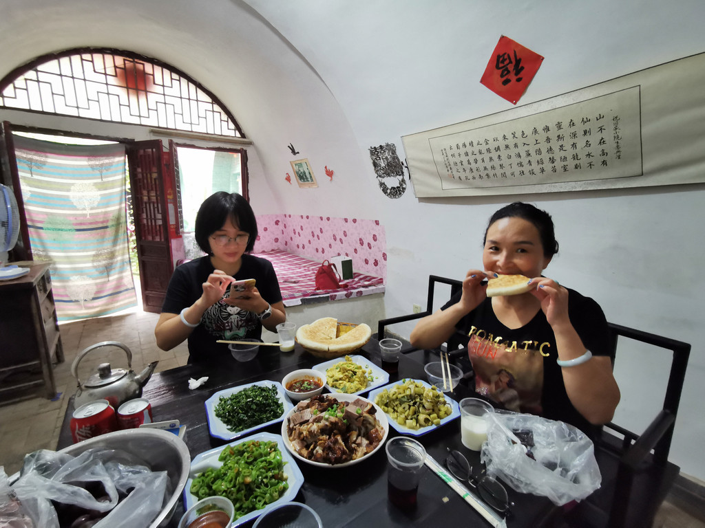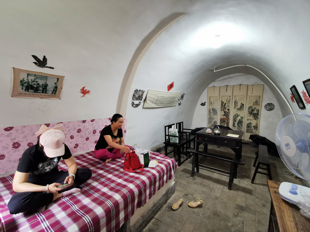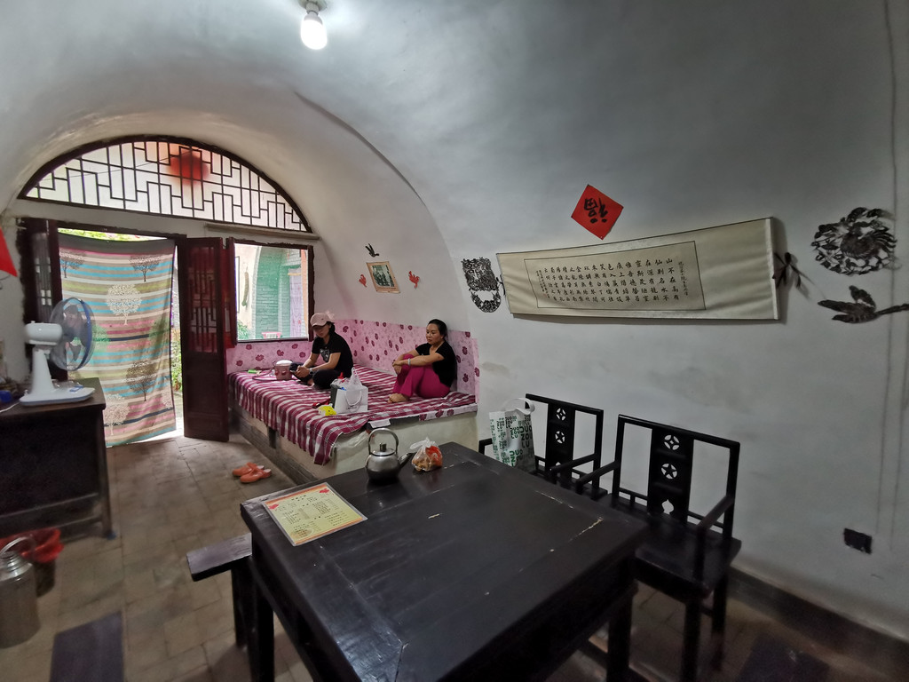 这里许多家地坑院农家乐接待客人,我们随意找了家停车方便的小同农家乐,沿着进院的斜坡地道走了进去。主人热情的接待了我们,进入院中花卉树木绽放有秩,书画屏风雅致井然。进得房中,是拱形的窑洞,室内炕、桌、电扇、被褥齐备,书画作品显示主人的鉴赏水平。我们点了几样当地农家饭菜,很快就上桌了,吃着美食喝点小酒聊天,非常惬意。吃过午饭,因为下雨也没有出去在村子里走动,就在炕上躺下休息了,主人拿来了被子,美美的睡了一觉。主任介绍说,地坑院大致相同,村里古树参天,窑洞里夏季特别凉爽,建议我们最热的时候来避暑,特别凉爽舒适。