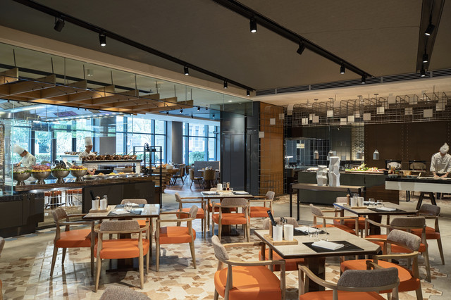 万荟轩自助餐厅以独具创新美食和以全开放式厨房为特点而闻名的万荟轩位于酒店五楼,酒店行政总厨精心苛选食材和菜品搭配,根据全球地域差异和宾客饮食偏好,推出琳琅满目的国际自助美食,本地海鲜,以及滋补小火锅,为这缤纷多彩的欢庆时节再添亮丽。您可尽享寰宇盛宴自助晚餐,鲜美的日式美馔,更有主厨为您奉上“蚝门盛宴”,而这场海鲜盛宴的主角—生蚝,各种变身称霸你的胃。不限量高品质海鲜给你畅食的快感,向您的味蕾发出挑战!近百种精心烹饪的自助式美味佳肴,并搭配创意甜品和有机时蔬沙拉,软饮不限量畅饮。