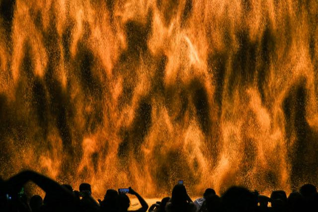 上万套机械与设备满场运转,三千吨大洪水倾泻而下,数百立方黄沙扑面而来,用虚实结合的表现手法打破舞台与观众区域的界限,沉浸式地感受一场艺术盛宴。