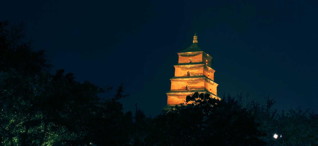 有几个加班到午夜的时刻,抱着衣服去顶层洗衣房,洗衣机轰隆隆的转动时,我就在午夜坐在大大的落地窗前,静静的看着不远处沉静的发着光的大雁塔,周围一片漆黑,厅里静悄悄的,不远处洗衣房有机器运作轻微的声响,那一刻是一天忙碌开班后难得的闲暇时光,静静的看着雁塔的微光,就像一夜读懂了她身上深沉而久远的历史。