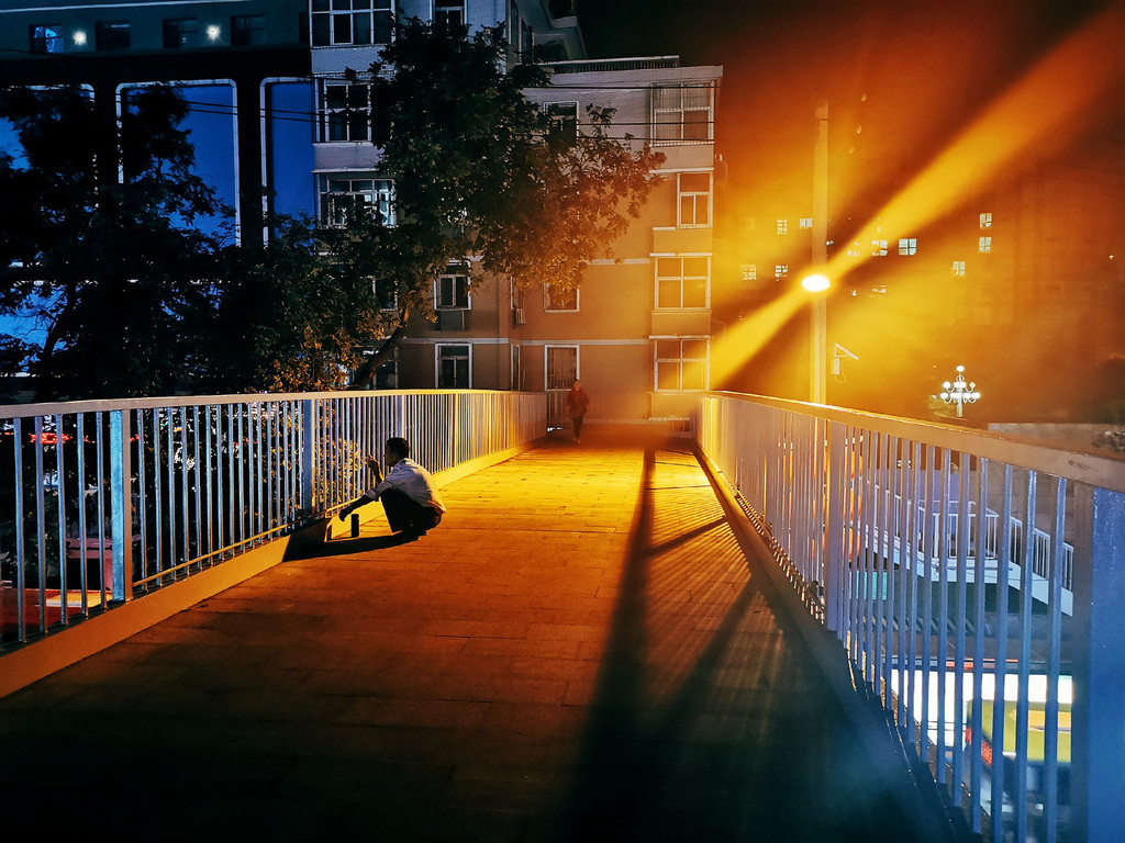 有晚归的人蹲在天桥上点燃一根烟,看着桥下的车水马龙,不知道他在想什么,但那画面刚刚好就那里,像是预演好了一般,落寞却意外的宽慰匆匆的旅人。
