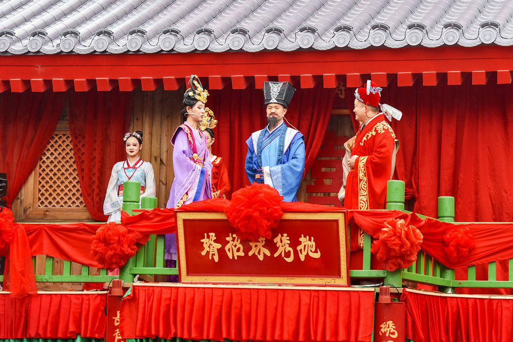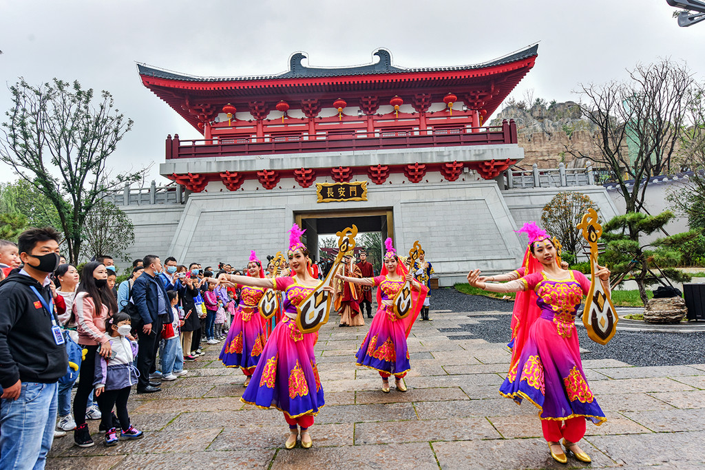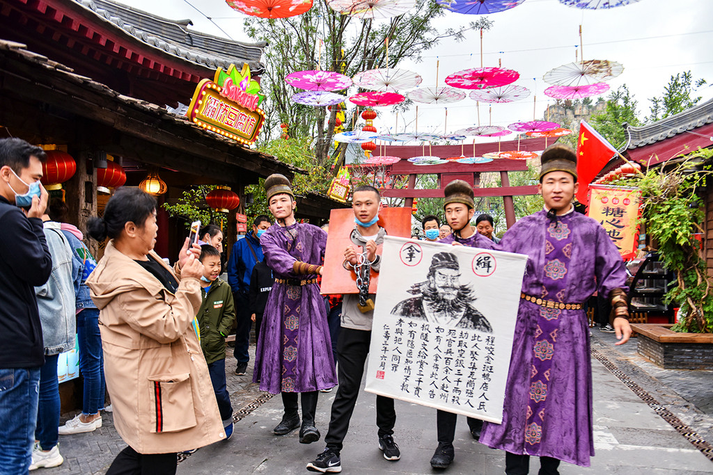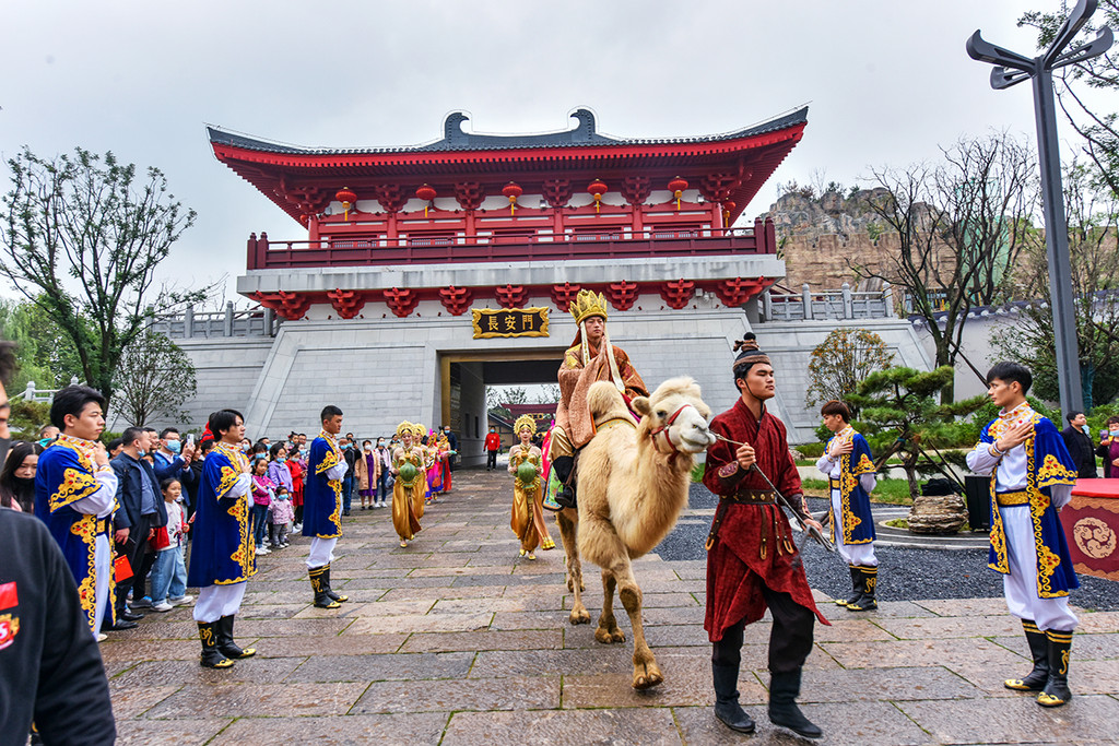 虽然是阴雨天,但西安宋城演艺王国里的热闹那也不是盖的,到处人声鼎沸,《抛绣球招婿》、《喀秋莎》、《锅庄》、《走街》、《古今快闪秀》等多台室内外演出,在景区掀起一波又一波的小高潮。