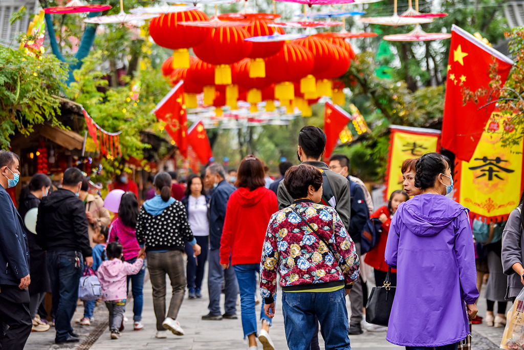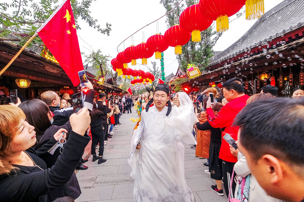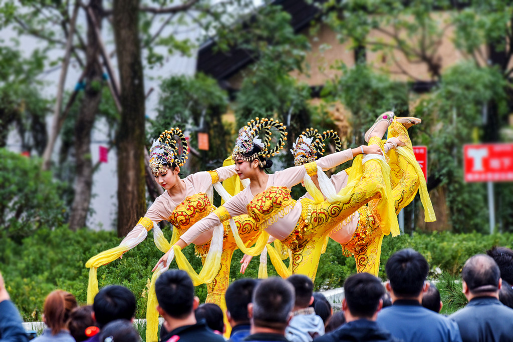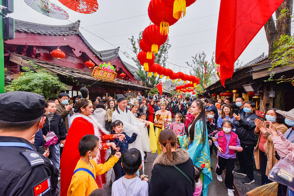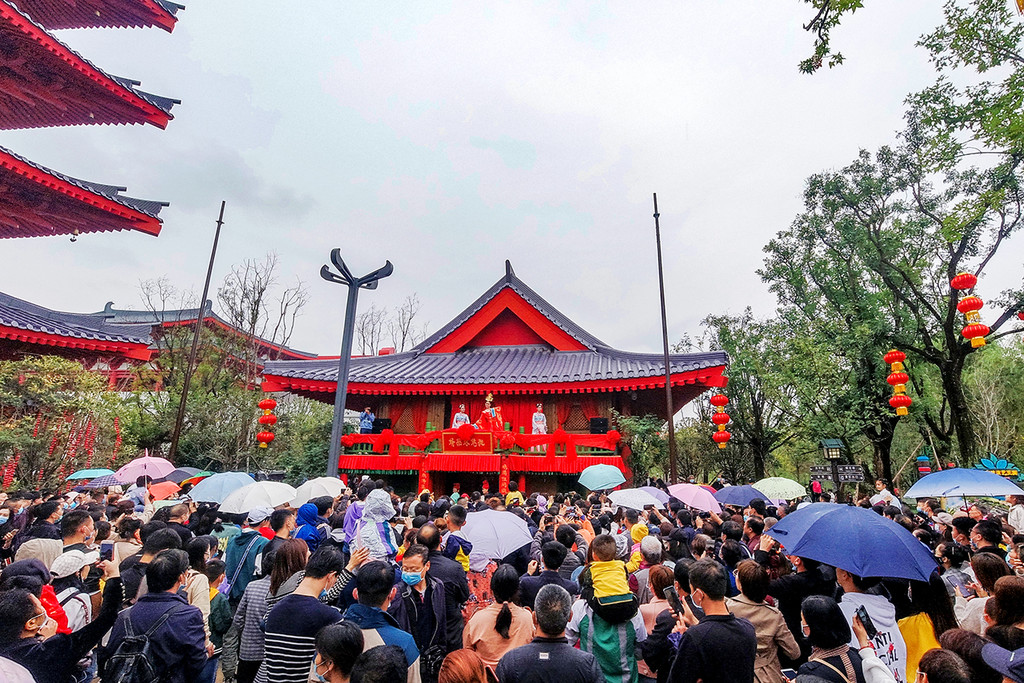 虽然是阴雨天,但西安宋城演艺王国里的热闹那也不是盖的,到处人声鼎沸,《抛绣球招婿》、《喀秋莎》、《锅庄》、《走街》、《古今快闪秀》等多台室内外演出,在景区掀起一波又一波的小高潮。