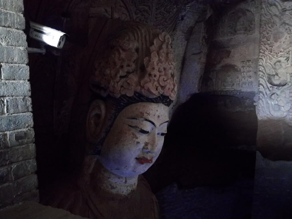 值得一提的是那大佛,共三尊。中间一尊是阿弥陀佛,旁边两尊是两位菩萨。当时没有看到简介碑文,回来查了一下,两位菩萨应该是观音菩萨和大势至菩萨,她们与阿弥陀佛并称“西方三圣”。之所以这大佛值得一赏,是因为这阿弥陀佛的造像据称有二十米高,比龙门石窟最大的佛像还要高。最可幸的地方是,游人不是匍匐在佛像的脚下去瞻仰其庄严的面容,而是可以登到明镜台上,从神龛中与大佛头部齐平的位置去观赏膜拜。从窄窄的佛洞走进去,被后人重新修复并着了色的巨大的佛陀脸庞就逐渐呈现了出来,衬着淡淡的光,和着佛陀头顶深凹进去的高阔天穹里层层叠叠的小佛像、菩提树(嗯,我不知道那长着绿叶的纹饰到底是象征什么,我就按自己的理解,把它们写成菩提树了),给人的视觉感受还是很震撼的。不过,感觉阿弥陀佛的脸部被重修得有点毁,这里就不上图了,以免毁误了看客的想象。放一张菩萨的图,感觉这张图比较好地再现了初见大佛的意境。