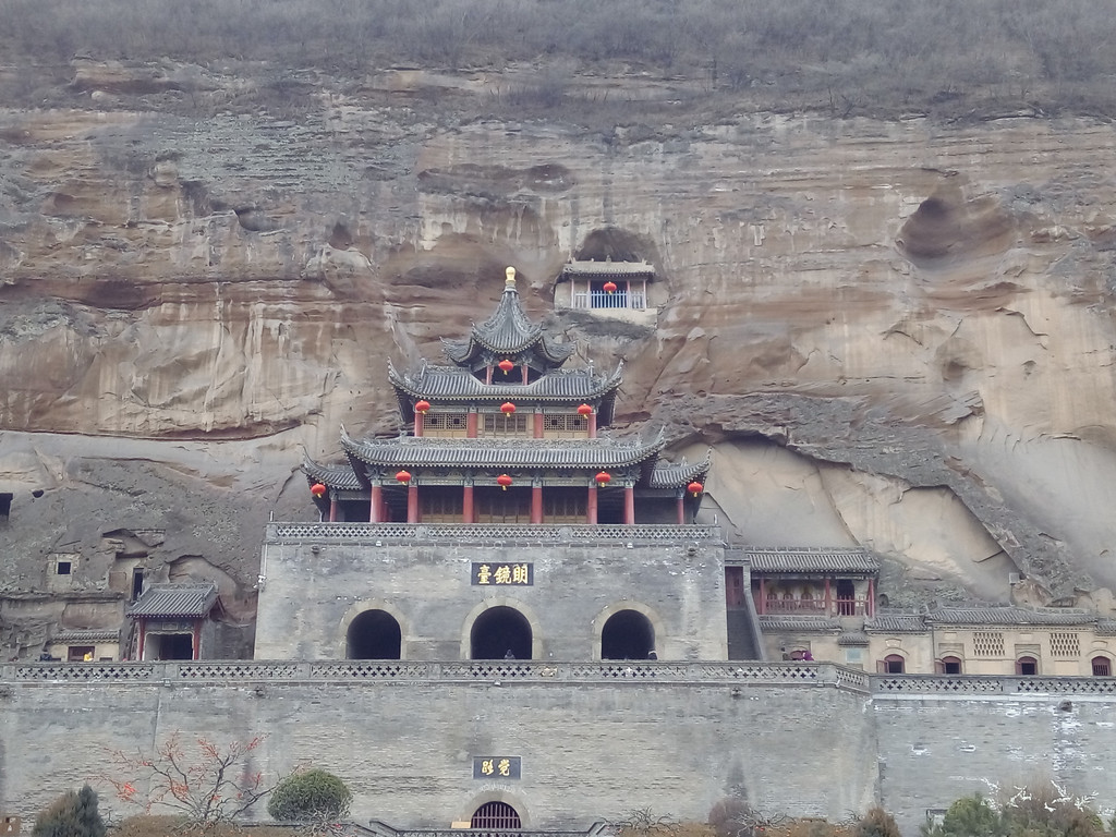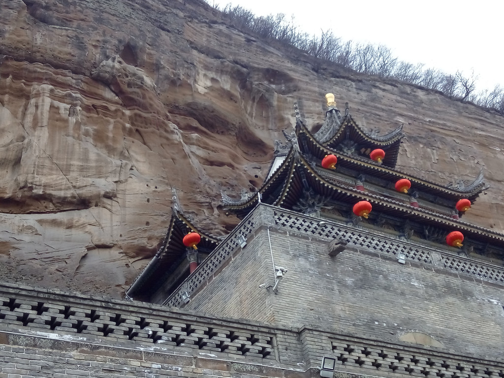 去之前,在网上看了一个挑剔游客的攻略,大致知道那儿的佛像艺术技法不是很精湛,所以对此行的景物带来的震撼之感期待很弱。然而当我花完20块钱门票踏入景区的时候,还是被眼前所见激起了赞叹之情——石窟是嵌在一片被劈得笔直的山崖上,不同于龙门石窟那种朴实厚重的灰白,这里的山崖竟带着浅浅的粉,仿佛少女宁静恬淡的侧颜,顿时多了一分活泼灵动的气息。山崖正前方的山脚下,耸立着一座被称为“明镜台”的精致楼宇,其上三层顶部的六角攒尖式木构楼阁,因春节的原因,每个尖角处都悬了盏红灯笼。大概楼宇中原来挂的应该是佛铃,只是现在被灯笼给遮住了,凉凉的冷风袭来,灯笼就像那少女发髻上的步摇,轻轻地晃动起来,掩在其后的佛铃随之发出清越的铃声,飘飘袅袅,很有意境。