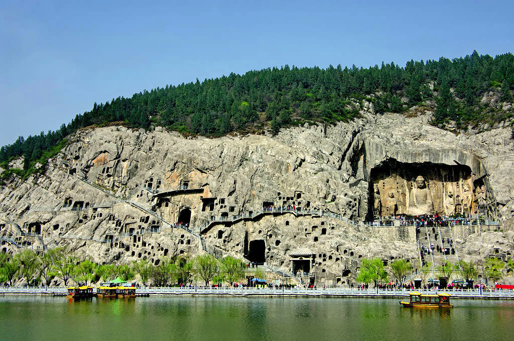 (以下来一张为网上当的龙门石窟的外景图——自己拍的图存在另一台电脑上,懒得去翻了;大佛寺的图都是我用办宽带送的中兴手机拍的,可能色泽呈现的不够,凑合看吧——可以对比以下朴实的山崖和少女粉嘟脸庞的山崖颜色哈)