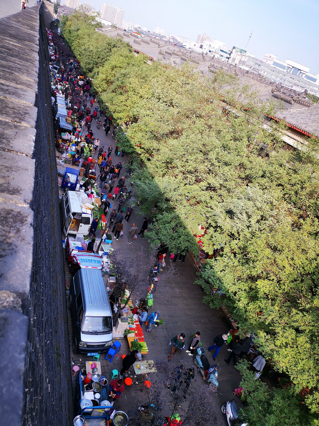 城墙:我们是从南门(永宁门)进,北门(安远门)出。门票54元/人,据说以后可能会限制不再允许上城墙以免破坏文物了。上了城墙后往左就能看见自行车租赁了,45元/3小时/单人车,90元/3小时/二人单车。城墙上骑单车的感觉实在太爽了,人少,只有游客,因为要门票,偶尔有些跑步者。能并排行驶4台轿车的城墙,虽然路面不是很平坦,微风袭来,太舒服了,城墙上公共厕所也有不少,不必担心。城墙边上有个集市,顿时有了人间烟火味。我们慢悠悠骑了一小时,拍拍照,安远门出来即可,建议不要再往前了,再往前的东门离得很远,还自行车的点就这4个。安远门出来离我们的下一站大明宫也比较近,但我们还是坐了滴滴,哈哈。