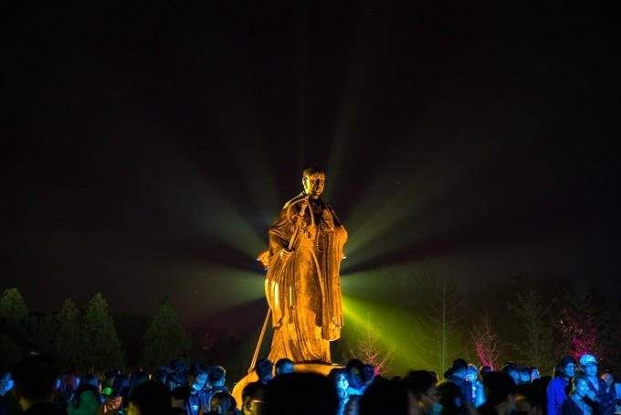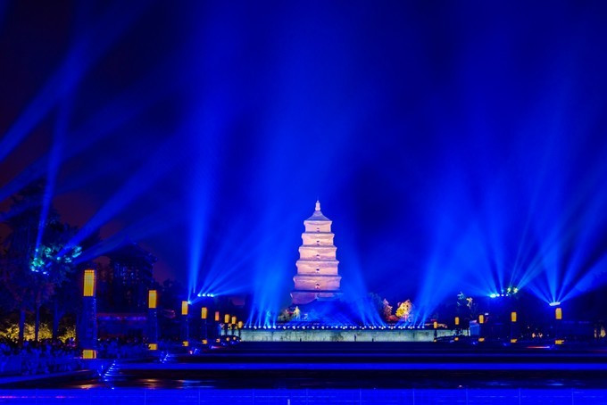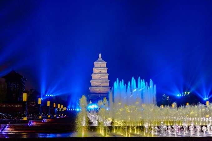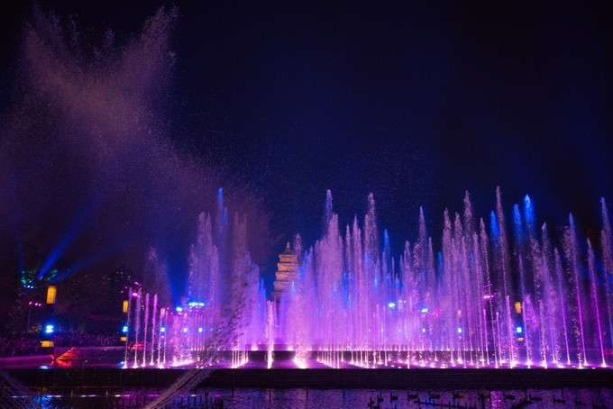 大雁塔广场上早早就聚集了等待的游客,一场盛大的灯光水舞秀即将上演。光影交错,水舞玲珑,音乐久久回荡在 西安 城。