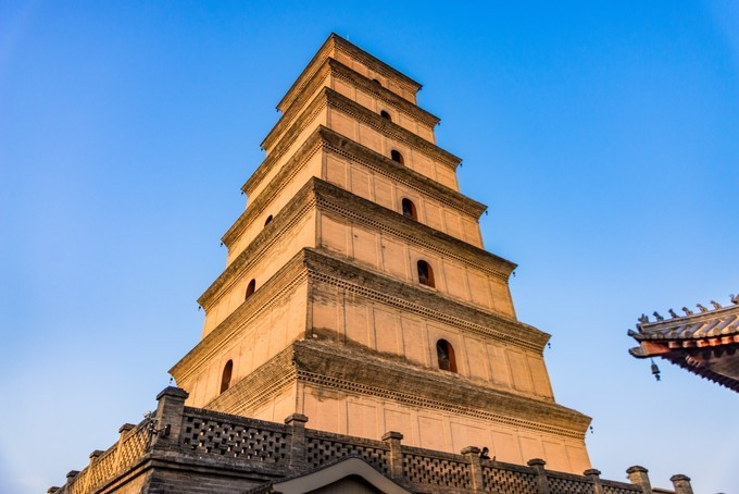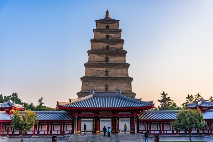 来到 西安 ,必去大雁塔。 唐高宗永徽三年,玄奘奏请建造雁塔,到十月建成。初时塔为五层,砖表土心。公元701-704年,武则 天长 安年间重修时改建为七层楼阁式砖塔,一直保存至今。该塔是为保存从 印度 取回的贝多罗树叶梵文经而建的,并葬有舍利子万余颗。