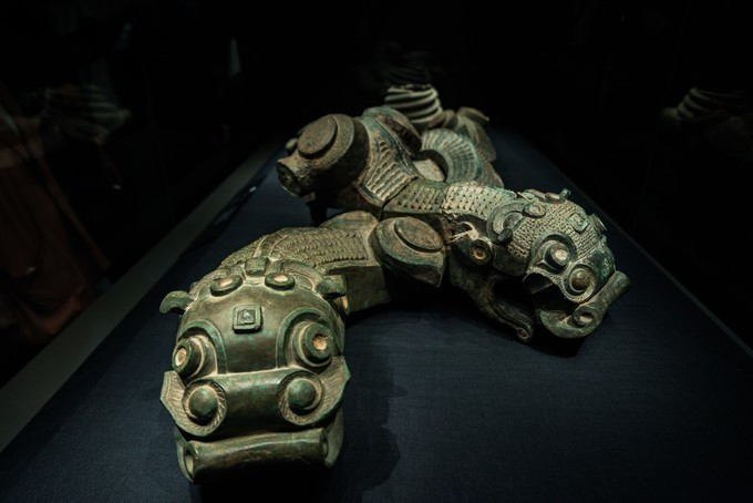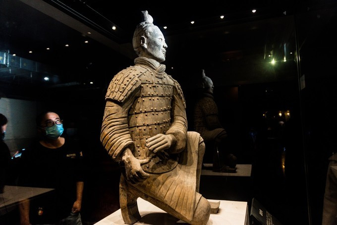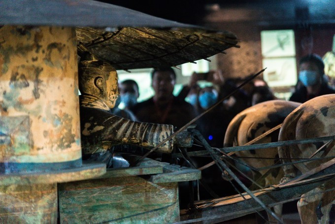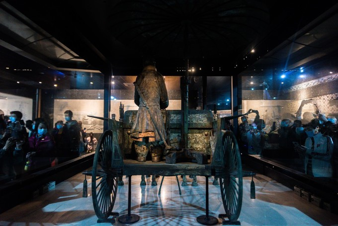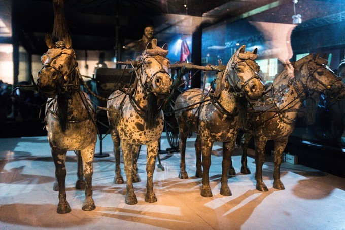 除了三个俑坑,还有一个铜车马展厅,铜车马是秦始皇的陪葬品之一,象征着秦始皇銮驾的一部分。铜车马的形制是模仿实实在在真车的形状。以前考古发现的车都是木质的,出土时已腐朽,铜车马的出土使我们能够清楚地看到古代御用车驾的真实面貌。铜车马是按秦始皇御用车队中属车二分之一的比例缩小制成的,车盖以及车舆内外彩绘着精美的纹样;两乘铜车马上的金银饰品重达14公斤,显示了铜车马高贵的等级。