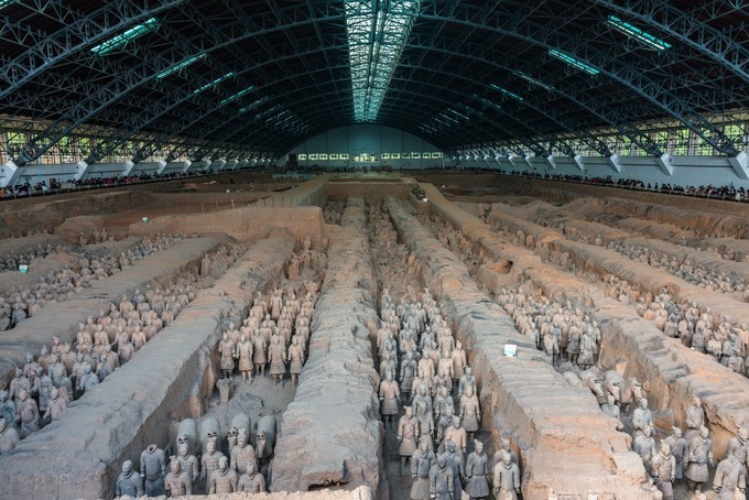 秦始皇陵位于 陕西 省 西安 市 临潼 区境内,它南依骊山,北临渭水,陵冢高大雄伟,一眼望去犹如巍峨耸立的一座山丘。秦兵马俑坑位于秦始皇陵墓东侧1.5公里处。一号坑是1974年春天当地农民打井时偶然发现的,后经考古队发掘、探测又相继发现了两个俑坑。根据发现的次序,编为一号坑、二号坑、三号坑。三个俑坑均为地下坑道式土木结构建筑,总面积有2万多平方米,内有陶质兵马俑近8000件,战车百余乘。它们模拟古代军队编列,组成一个庞大的军事场面,为古今中外历史所罕见。