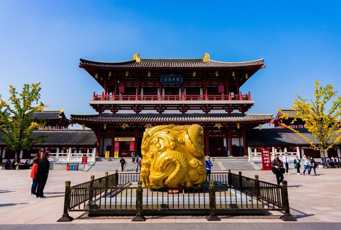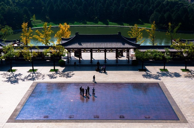 走进西大门,迎面可以看到一方巨大的玉玺,上面刻有大唐芙蓉园五个大字,玉玺下方的地面盖有这五个大字的印文。玉玺象征着封建皇权,而芙蓉园也正是李唐王朝的御苑,玉玺雕塑造型也从艺术审美的角度渲染了皇家园林的恢弘大气。