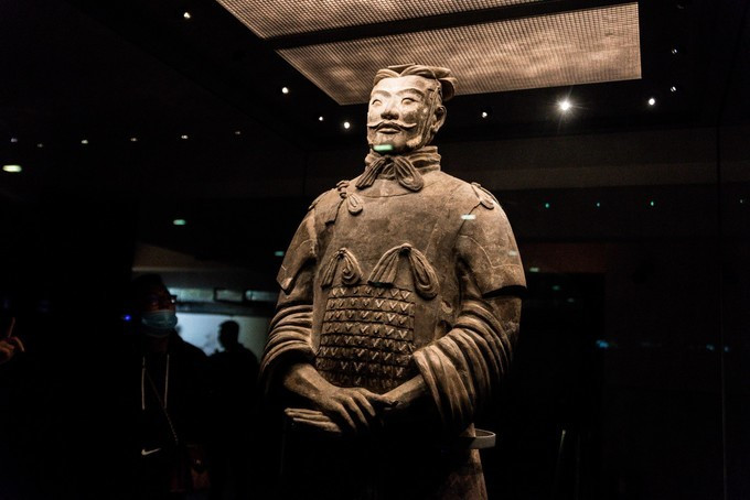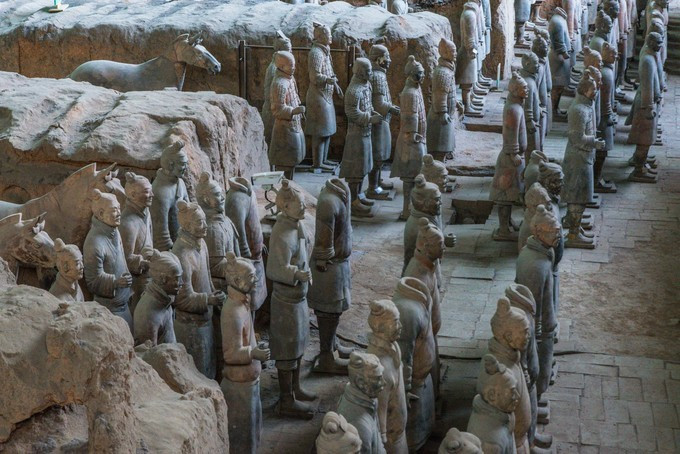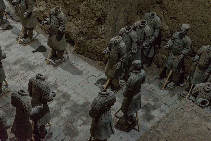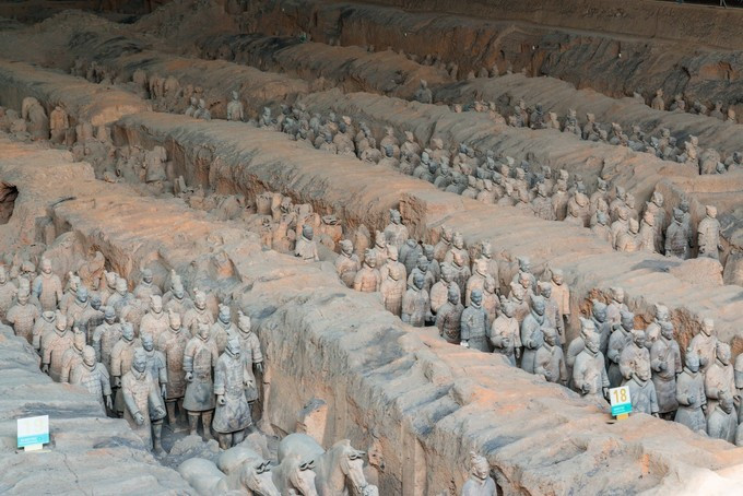 三座兵马俑坑中,最大的是一号坑,它的总面积达14260平方米。据推算可出土陶俑、陶马6000余件,为战车和步兵混合编组的长方形军阵。它由前锋、主体、侧翼、后卫四部分组成,俑坑东端的长廊部分有三排面向东的武士俑,每排68件,共204件。这些武士俑大多身着战袍,手持弓弩,面向东方,构成了这个军阵的前锋。在俑坑的南、北两侧,各有一列面向南、北的武士俑,构成了这个军阵的侧翼。在俑坑的西端,还有一列面向西的武士俑,构成了这个军阵的后卫。俑坑的中部有38路纵队,全部由步兵、车兵排列组成,说明这个军阵的组织严密和完整,体现了古代兵书所说的“前后整齐,四方为绳”的方阵。