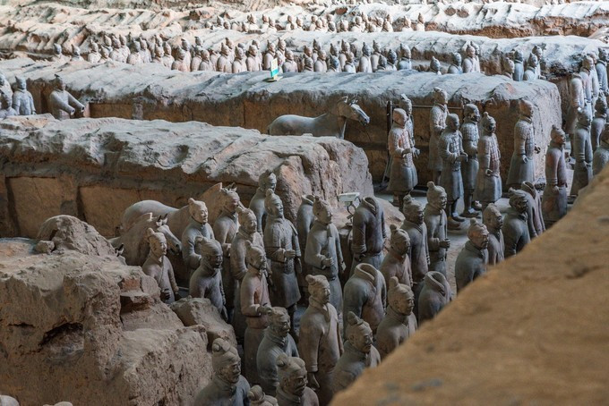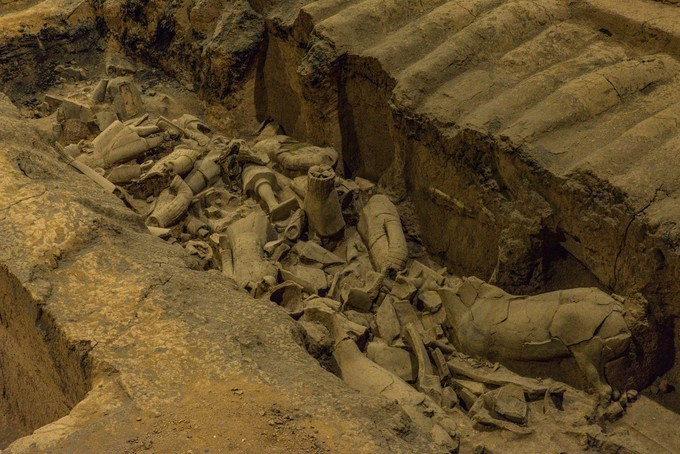 二号坑最复杂,占地6000平方米。根据钻探和局部试掘情况推算,二号坑可出土陶制兵马俑1300余件,木质战车80余辆,是一个由战车、步兵、骑兵和弩兵等兵种混合编组的大型军阵。
