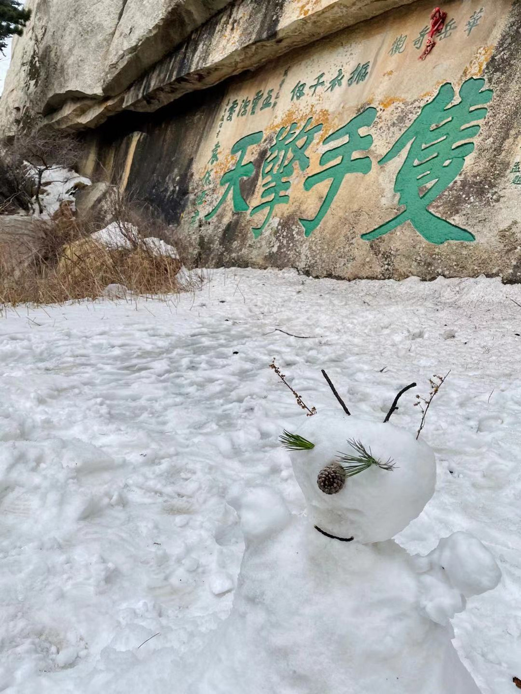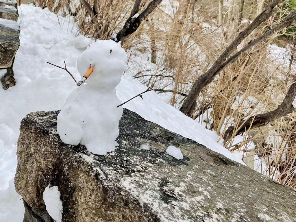 中峰下来又看到一处大型雪人,不远处终于找到作者,一个很可爱的女生,看起来像是景区的工作人员,爱好堆雪人,和另一个帅哥拿着铁铲子在创作,雪人的水平和质量都很高呢,以至于看得我边走路还边崴了一下脚......