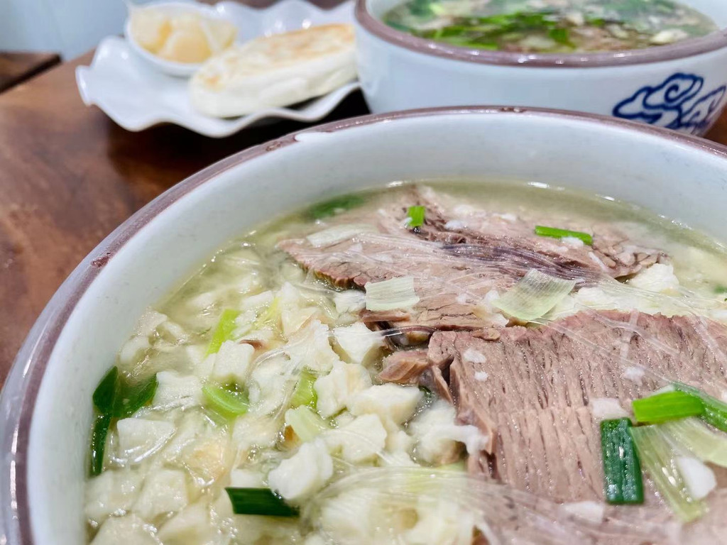 我选了回民街,直奔老孙家点了一碗泡馍,我知道啊,大家肯定要说回民街的不好吃,管他的呢,我一外地人,能评出啥好吃不好吃的,有人给我掰好馍我就谢谢他了,掰馍的事,最后一天再说,西安泡馍很好吃,至少牛肉大块,大大块。