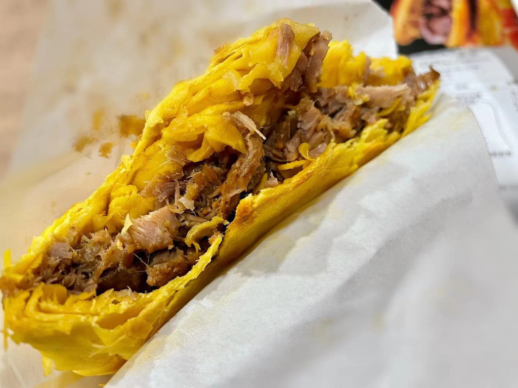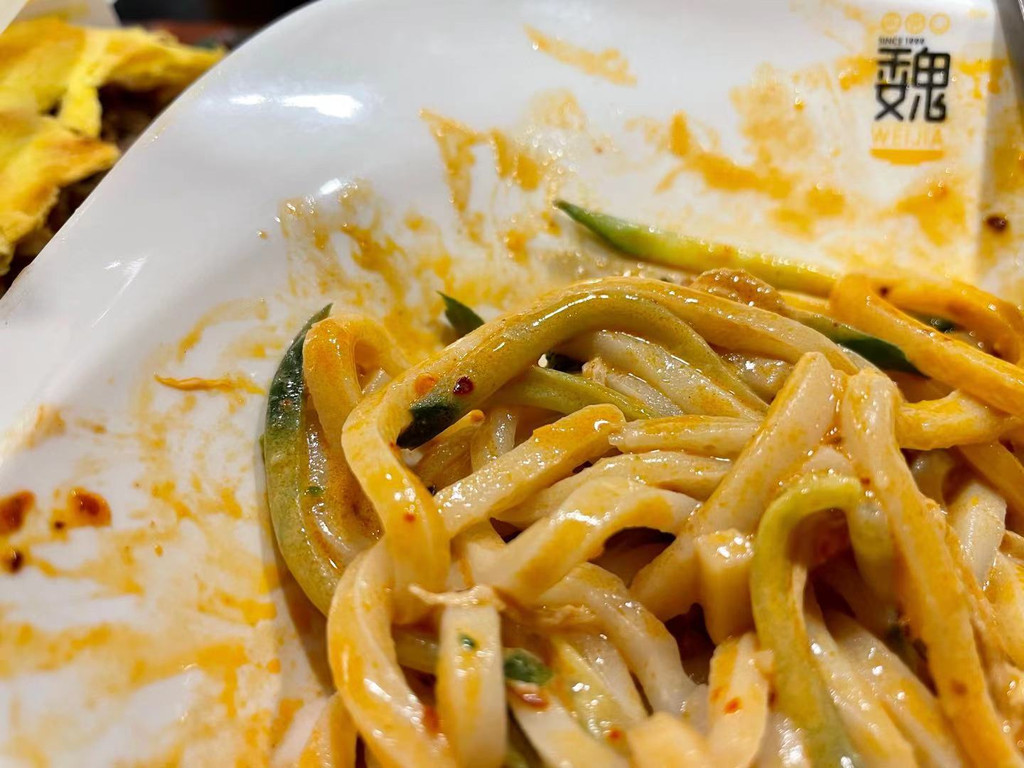 放下行李,选了酒店附近的一家魏家凉皮,之前没做过这家的攻略,只是因为从高铁站到酒店的路上看到了好多家,目测该是西安遍布大街小巷的连锁店了,反正凉皮肯定是西安特产啊,不可能是坑。但没想到比较吸引我的是魏家凉皮的黄馍馍肉夹馍,黄色的馍松松脆脆的,特别好吃,另外,这是第一次被西安美食惊人的牛肉量吓到,牛肉不贵的么?后面还有接二连三的,就习惯了这吃不完的量。