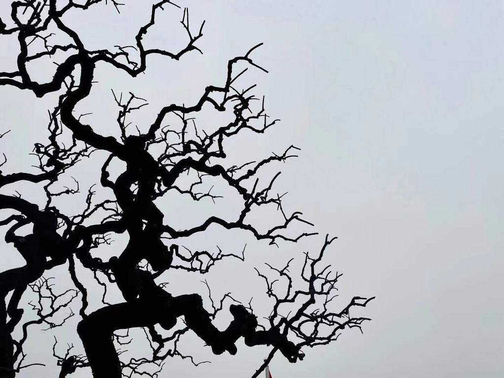 塔前的龙爪槐,只有对着阴阴沉沉的天空,才能看出它独特的魅力。