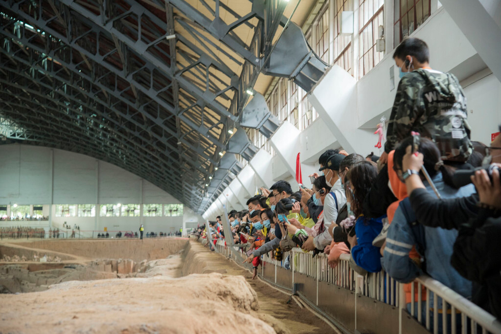 1号坑是最壮观的一个车马坑,后面还有未完成修复的场景,但十一工作人员也放假,所以看不到考古工作者在修复。