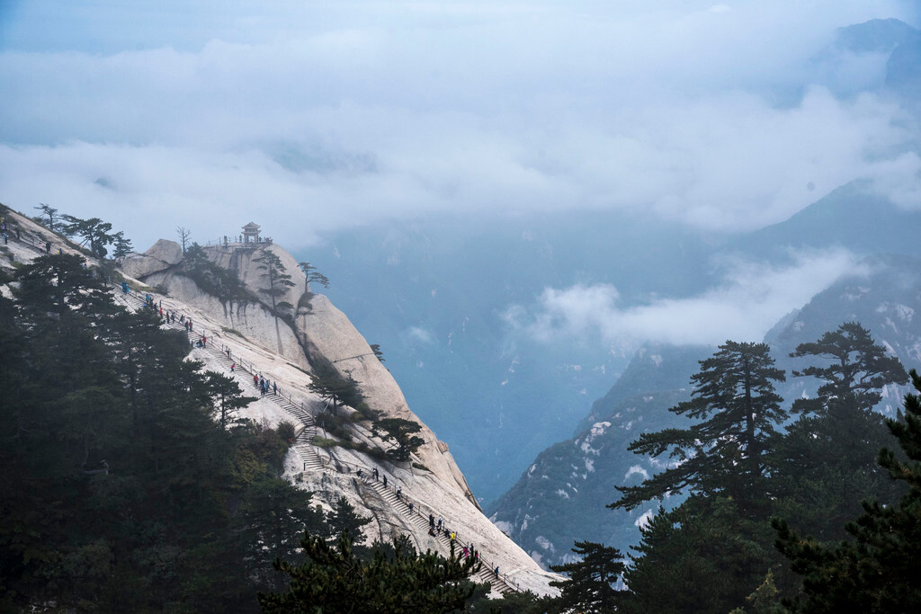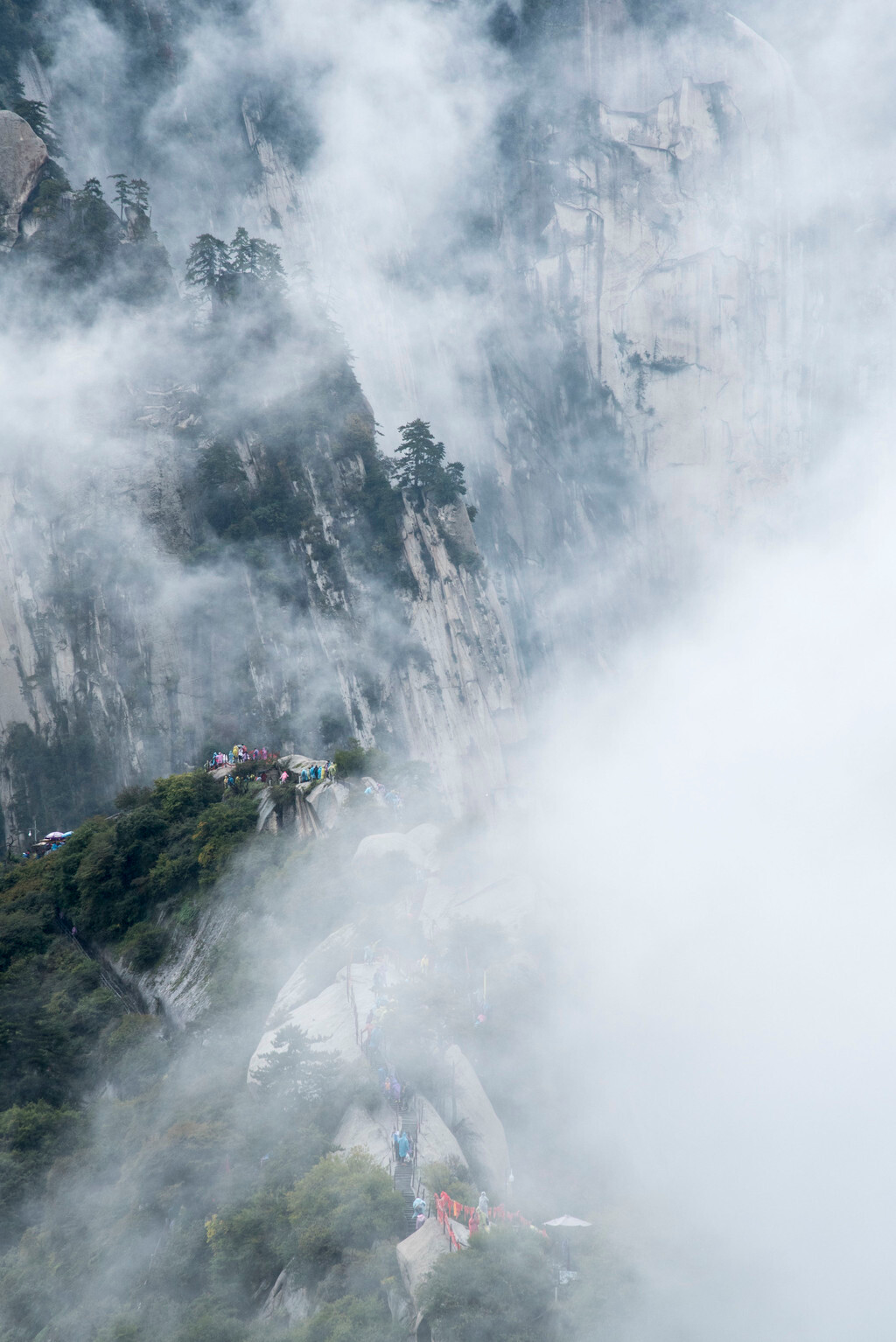 从西安去华山很方便,有高铁半小时就到,下车后坐1路公交,一车人全是去华山的,司机问清楚没有要中途下车的人,干脆就一路不停车,直接拉去华山门口。我们以为自己到的已经够早了,结果景区门口队排得老长……天上在淅沥沥的下着小雨,我俩很担心一直下雨没法好好玩儿,但也只能耐着性子排队。缆车的队比门口的更长,等了一个多小时,加上景区里坐小巴车到缆车下的时间,上到北峰上已经快中午了。但令人欣喜的是,雨停了。