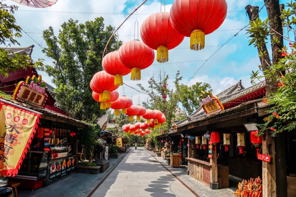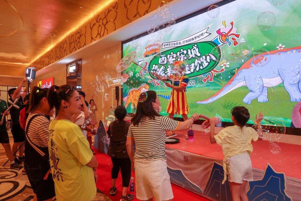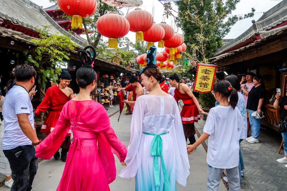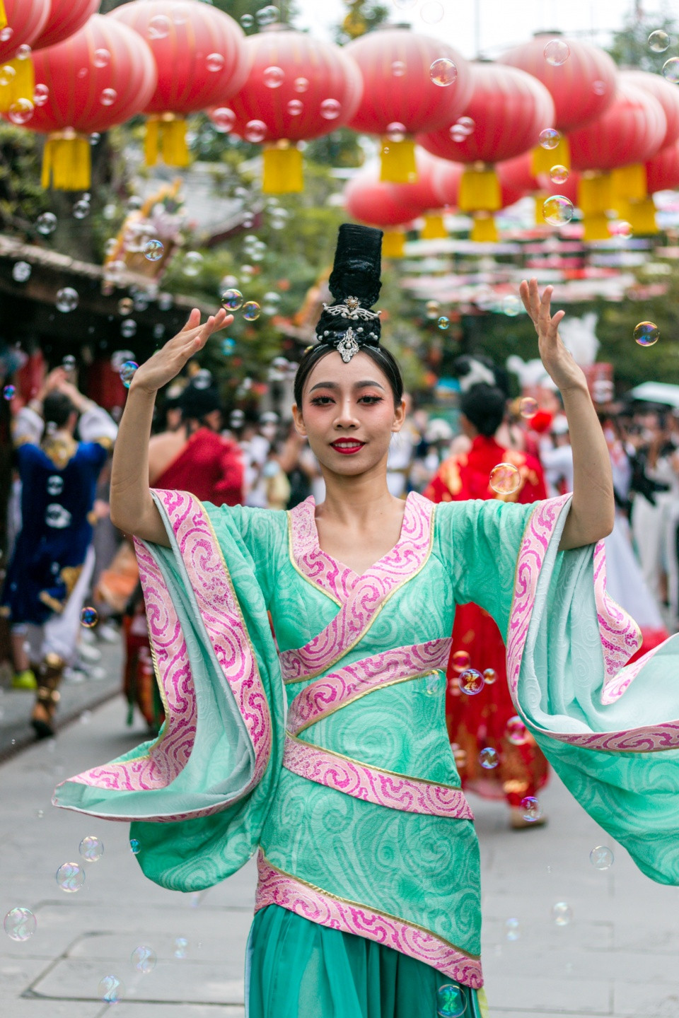 烟云街的国风快闪,穿汉服的小姐姐和民族服饰的小哥哥们一起伴随着漫天飞舞的泡泡载歌载舞,游客们也可以加入进来一起欢快的舞蹈哦。