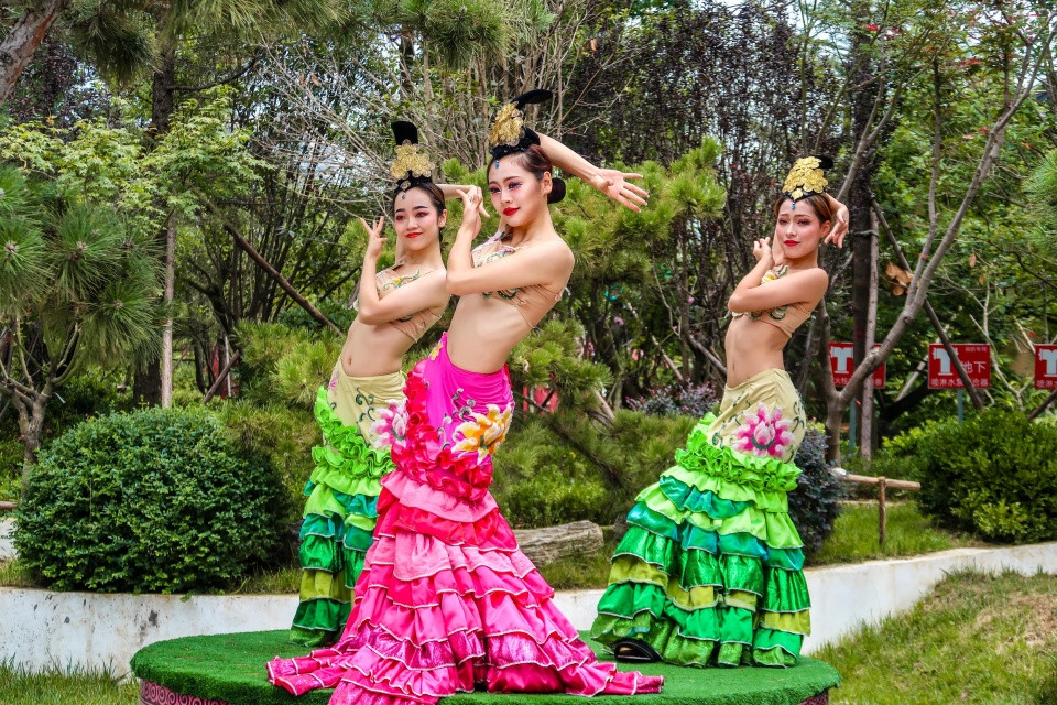 长安门内的莲花韵,婀娜多姿的姑娘们随着音乐翩翩起舞,大唐姑娘的美丽风姿完美展现,迎接着前来游玩的游客们。