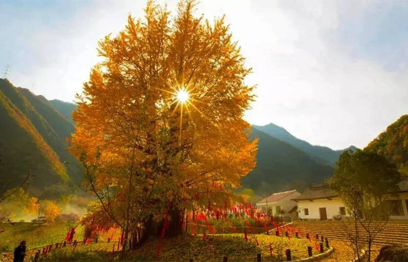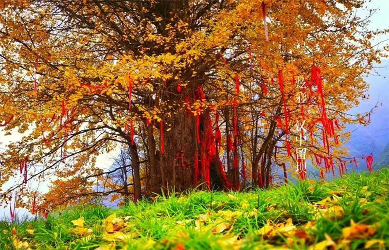 它就像一位慈祥的老人,不急不缓的在季节里行走,当别处的银杏树叶落归根的时候,它才一点一点由绿转黄,成为终南山下一道靓丽的风景。