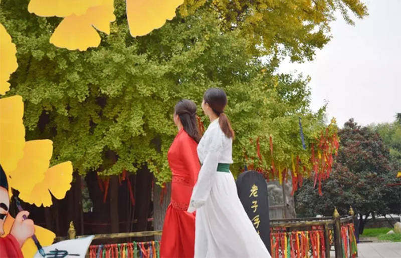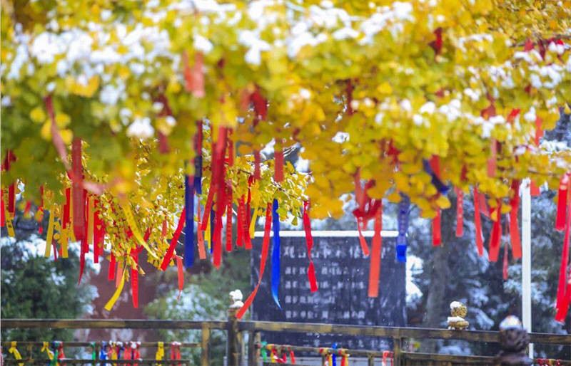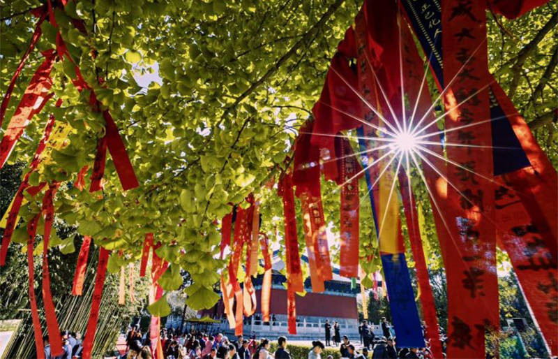 由绿转黄,是季节的脚步,在自然之中,轻缓移步所施的魔法,千万片树叶在枝头、在秋风中,肆意的随风起舞,红色的祈福布条将银杏树围绕,清新的绿色、明亮的黄色和浓郁的红色在秋日的楼观,展现着道法自然的玄妙色彩。