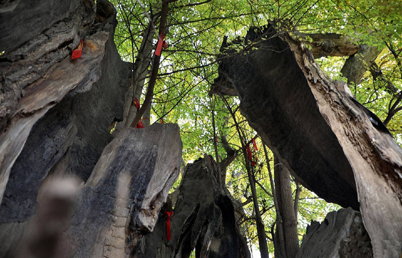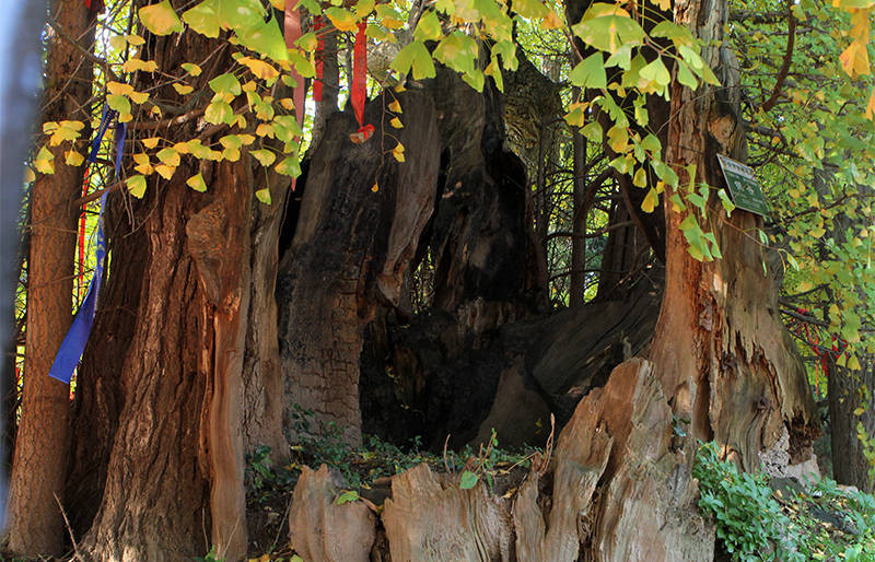 这是一棵没有年轮的树,上世纪60年代,这棵树曾因一场大火,树心被烧成了空洞,但它却凭着顽强的毅力,仅靠着几片厚实的树皮提供的养分,至今仍年年新绿,岁岁荣光,至深秋,华盖若金,美到了极致!